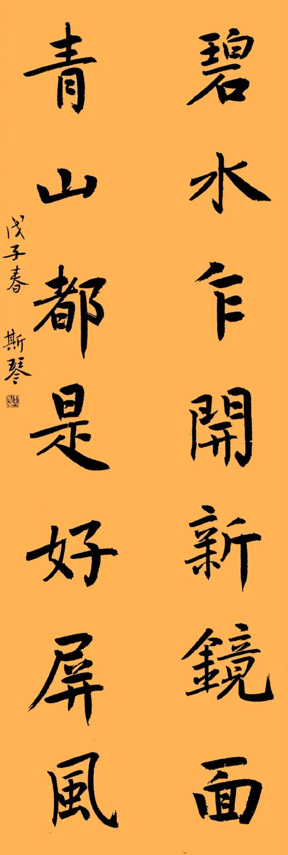 这幅作品内容是:碧水乍开新镜面,青山都是好屏风。