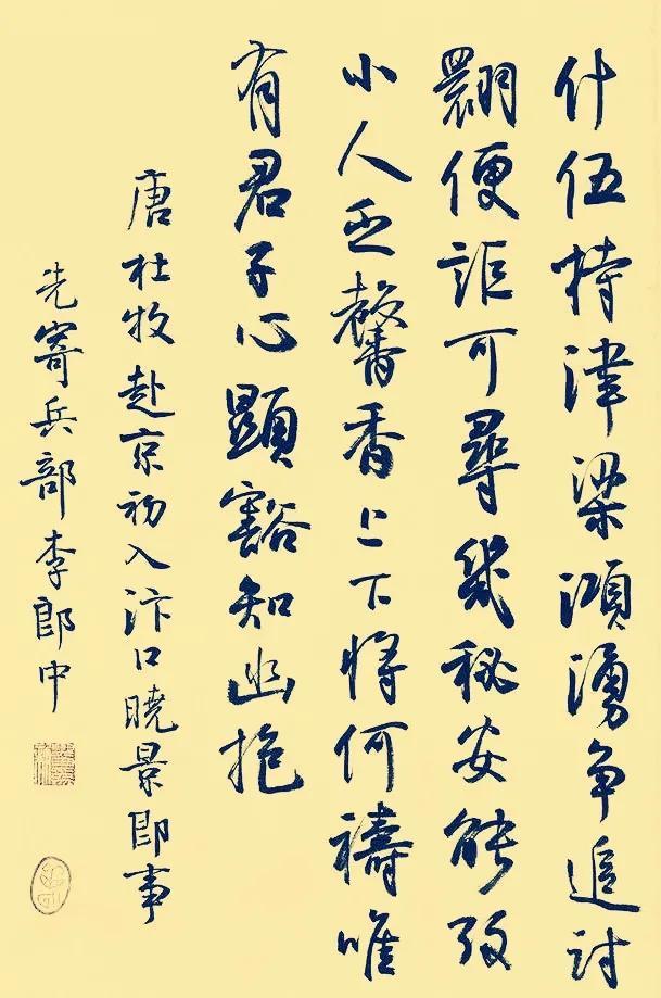 这幅作品所写的内容是:唐代杜牧创作的诗词《赴京初入汴口,晓景即事,先寄兵部李郎中》中的诗句。“什伍持津梁,澒涌争追讨。翾便讵可寻,几秘安能考。小人乏馨香,上下将何祷。唯有君子心,显豁知幽抱”。