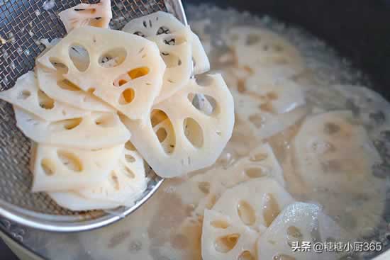 2、焯水可以让藕熟更快,口感更脆甜,而且烹饪时间短能减少氧化。