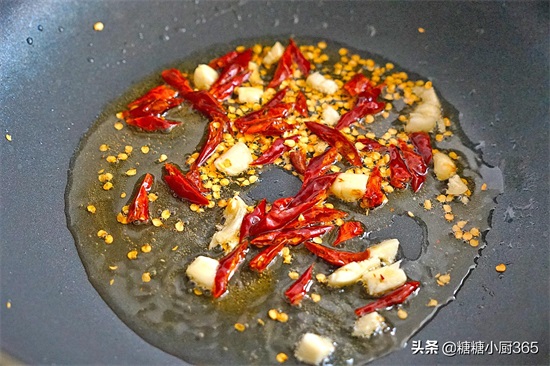 6、接下来要进行爆炒烹饪了,请准备好热锅热油,倒入红干椒和拍好的蒜碎爆一下。