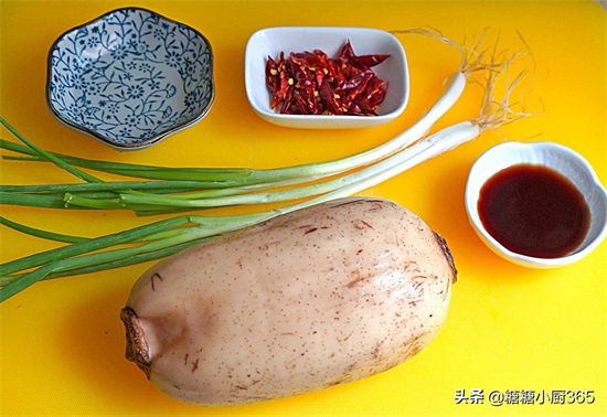 食材准备:莲藕1段、红干椒6克、生抽1茶匙、白醋少许、盐1茶匙、葱2适量